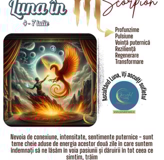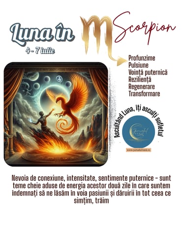 Dacă Luna prin Balanță încearcă să surprindă și să mențină frumusețea și armonia experienței vieții, Luna în Scorpion știe că, de-a lungul acestei călătorii, întâlnește inevitabil furtuni, pericole și întuneric, imersându-se în trăiri și nevoi profunde de a înțelege adevărul crud al existenței, cel care se află dincolo de cortină.